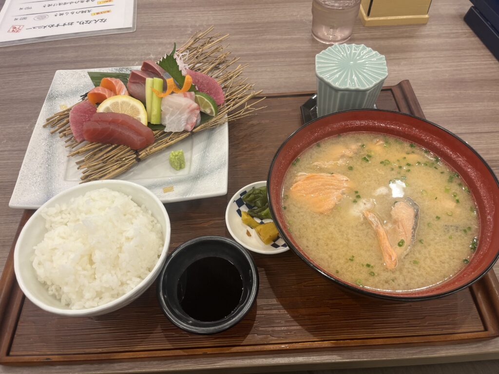 定食についていた鮭の味噌汁が身に染みて美味しかったです。お刺身も美味しい!サウナ後は、ご飯が進みますね。